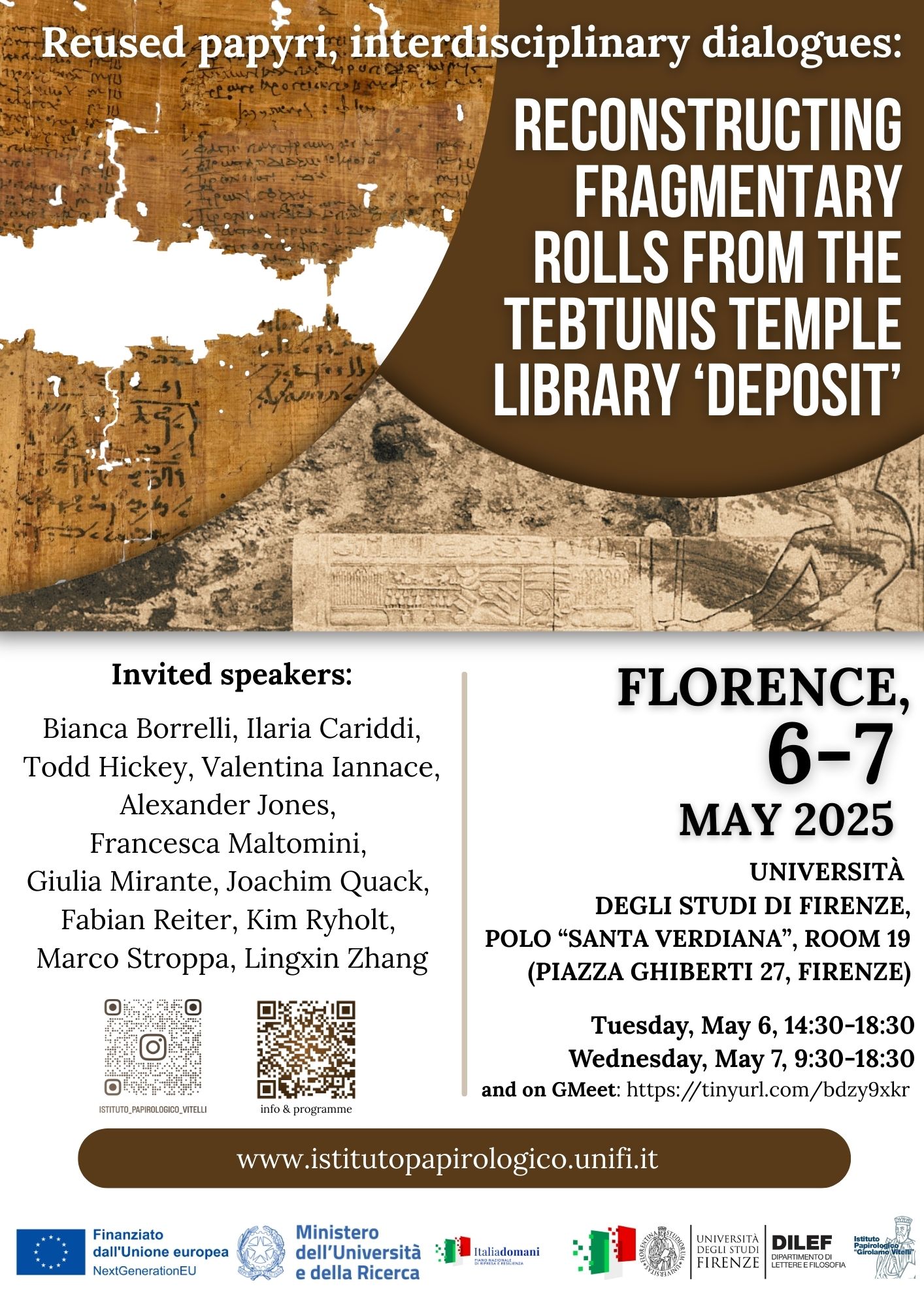 International Conference "Reused Papyri, Interdisciplinary Dialogues: Reconstructing Fragmentary Rolls from the Tebtunis Temple Library 'Deposit' ", in the PRIN PNRR 2022 project "Reconstructing Fragmentary Papyri through Human-Machine Interaction: case studies from two Italian collections".