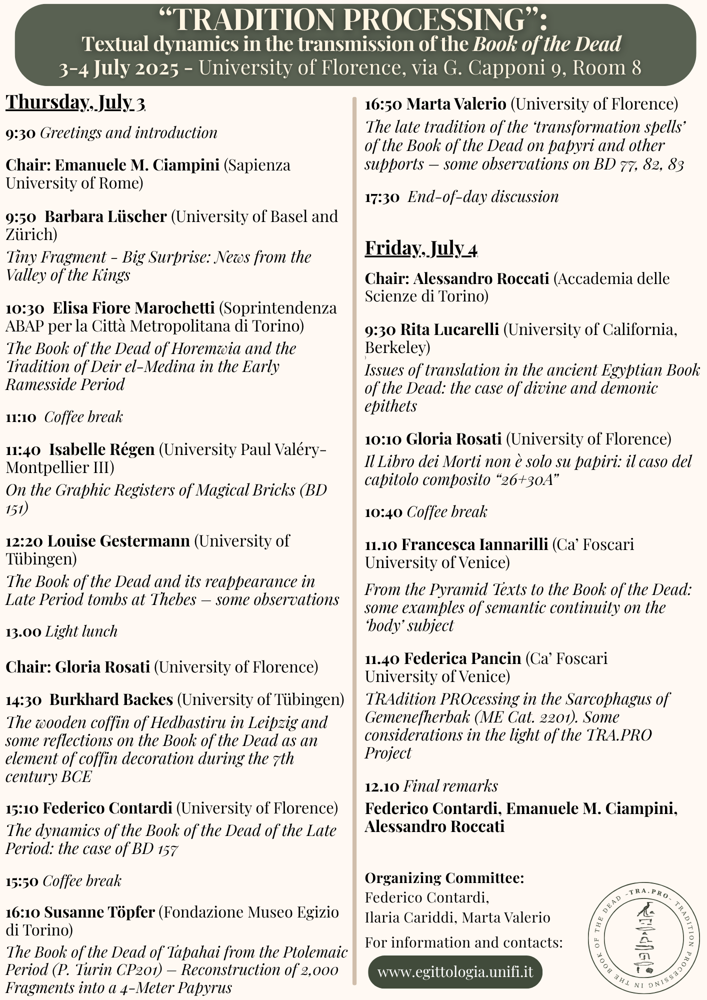 International workshop “Tradition Processing”: textual dynamics in the transmission of the Book of the Dead. Methodologies, current studies and research perspectives