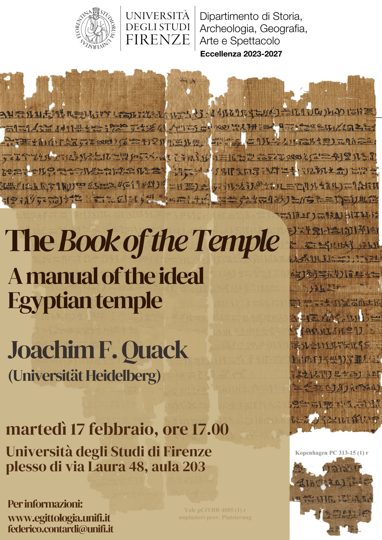 Martedì 17 febbraio 2026 si terrà la conferenza del prof. Joachim F. Quack (Heidelberg University) "The Book of the Temple: A manual of the ideal Egyptian temple" nel plesso di via Laura 48 dell'Università di Firenze, aula 203.