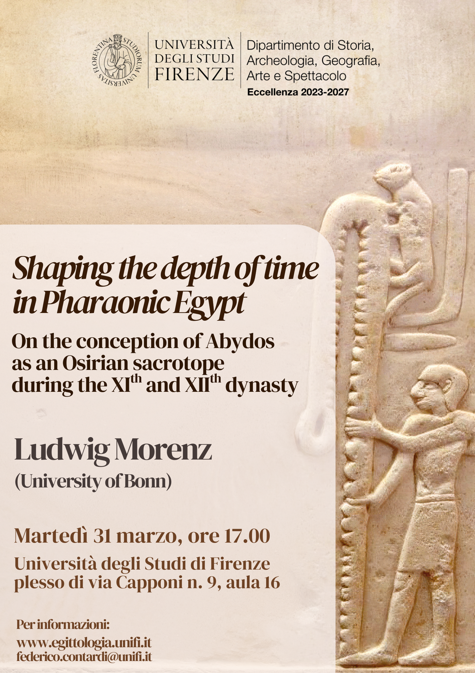 Martedì 31 marzo 2026 alle 17h si terrà la conferenza del prof. Ludwig Morenz (Bonn University) Shaping the depth of time in Pharaonic Egypt. On the conception of Abydos as an Osirian sacrotope during the XI and XII dynasty nel plesso di via Capponi 9 dell'Università di Firenze, aula 16
